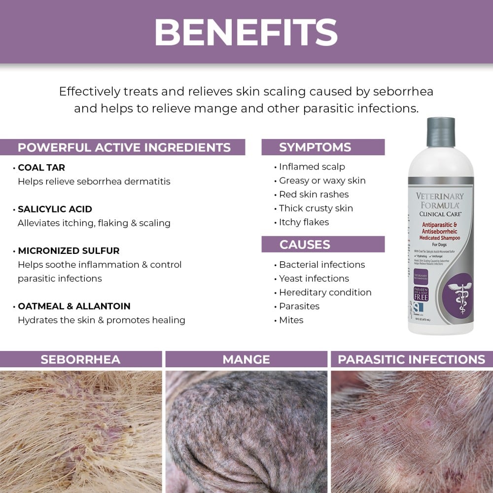 Effectively treats and relieves skin scaling caused by seborrhea, mange and other parasitic infections. The medicated formula is also effective against fungal and bacterial skin infections.